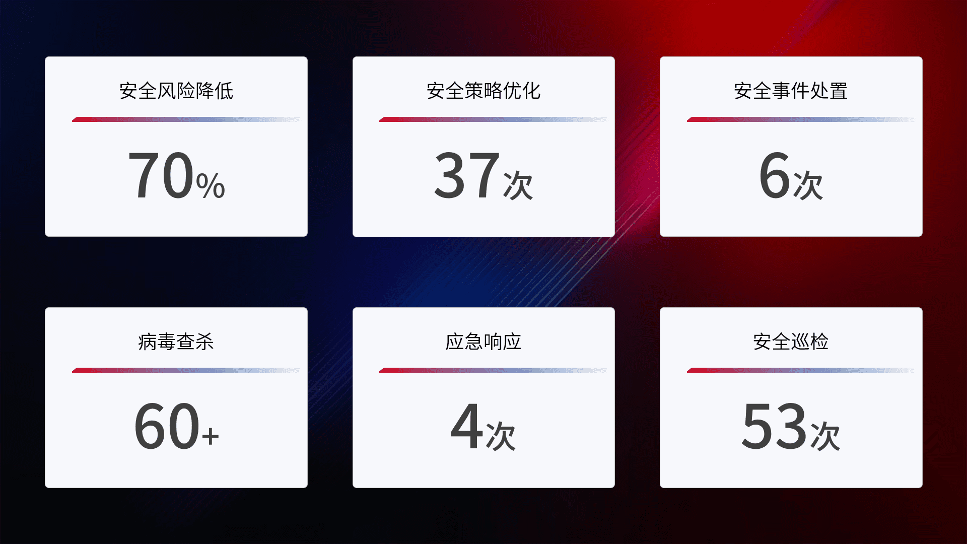 提供全面的安全事件报告体系,,包括处置报告、、周报、、、、季度和年度总结,,,,结合持续监控,,,,帮助客户深入了解网络安全状况。。