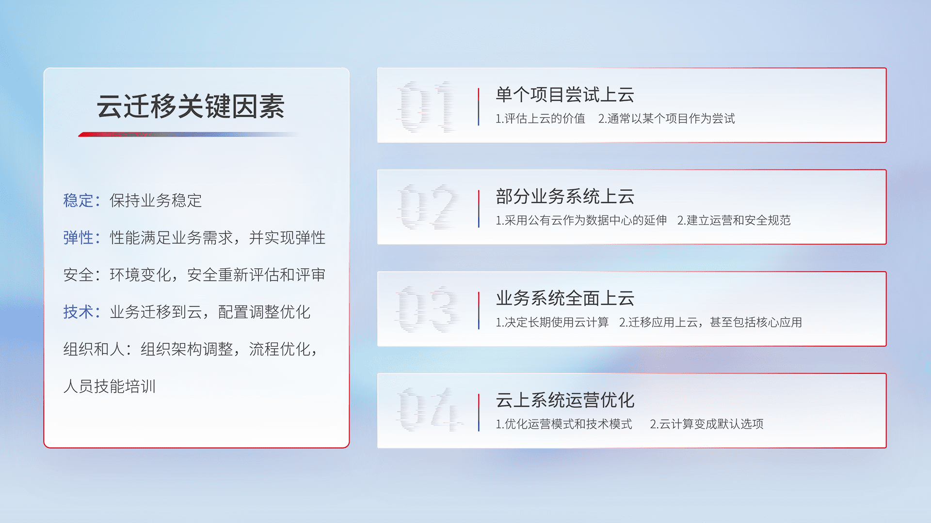 结合实际业务,,从规划设计、、、云平台选型、、、、云原生改造、、数据迁移、、集成交付,,,迁移全过程为客户识别最佳上云路径,,,,做好风险识别管理,,,,设计网络架构、、、身份权限、、、安全审计合规、、操作审计、、、日志审计、、、监控告警策略、、、、多站点容灾设计等,,,对云上基础设施进行整体规划,,,,提升IT治理水平,,以满足弹性、、、高可用、、、高性能的需求。。