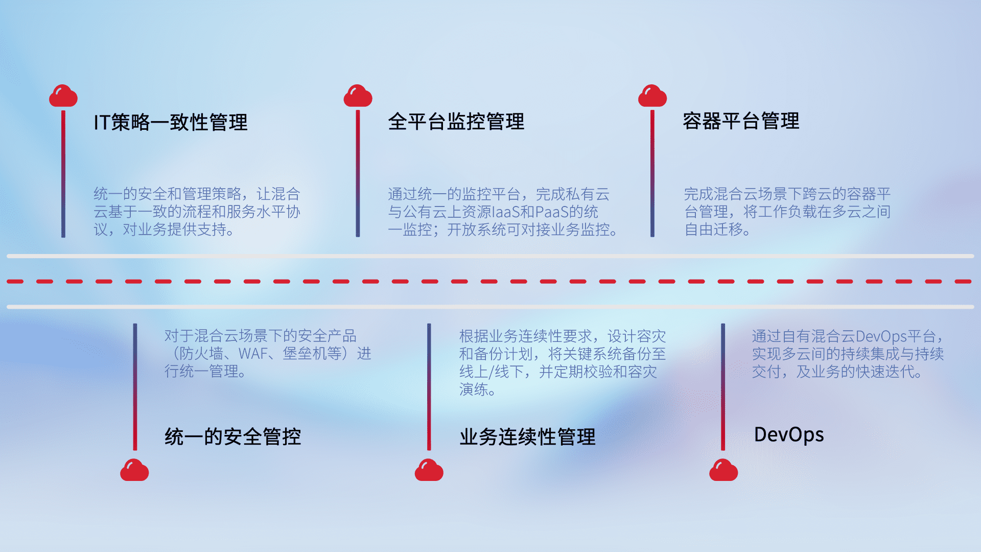 通过多云纳管,,,,以统一的资源数据模型把客户的云资源进行抽象和封装,,进而实现对多云资源的统一操作,,,,保障云资源管理的可靠性、、、稳定性与可用性。。量身定制化运维内容,,,,配置、、开发运维、、、、补丁管理、、、、备份、、监控、、、、认证和访问管理、、、、审计和日常巡检等,,,,保障在用云过程中的可靠度,,,稳定度以及高可用率。。。。